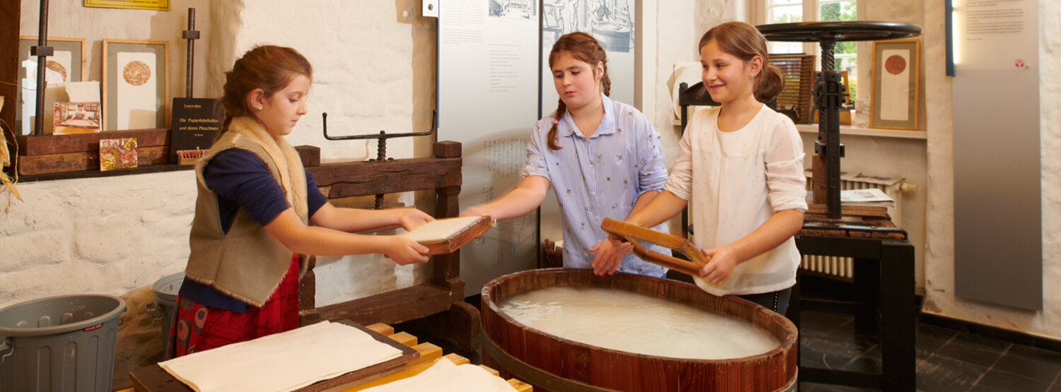 Erfahre etwas über die Geschichte der Papierfabrikation und schöpfe dein eigenes Papier. Dieses Angebot bieten wir auch in französischer Sprache an.